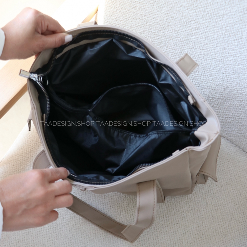 قسمت اصلی این کیف یکتکه است و با زیپ بسته میشود.