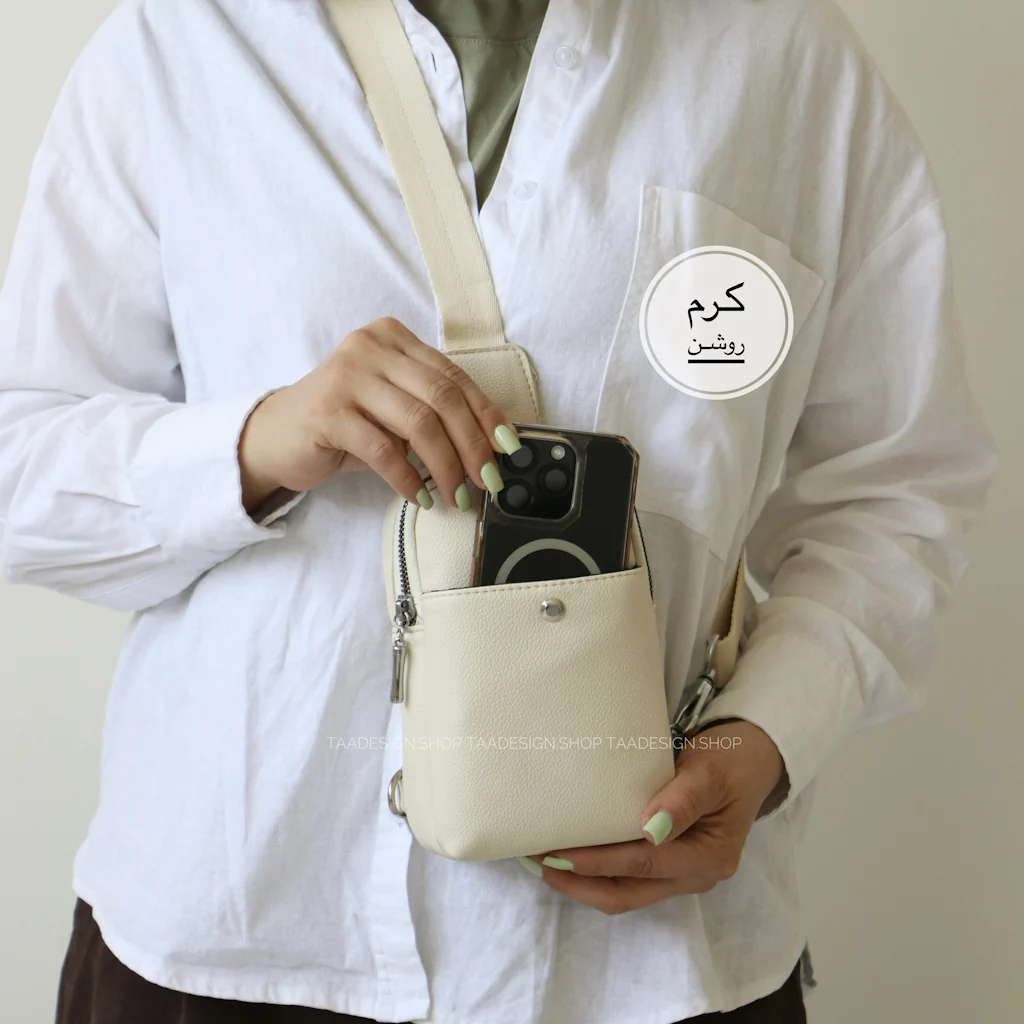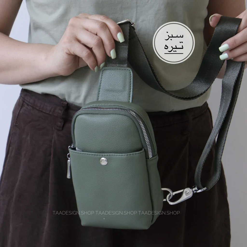 - این کیف دارای یک فضای کلی به همراه زیپ و جلوی کیف دارای یک جیب بهمراه دکمه،موبایل داخل کیف جا میشود