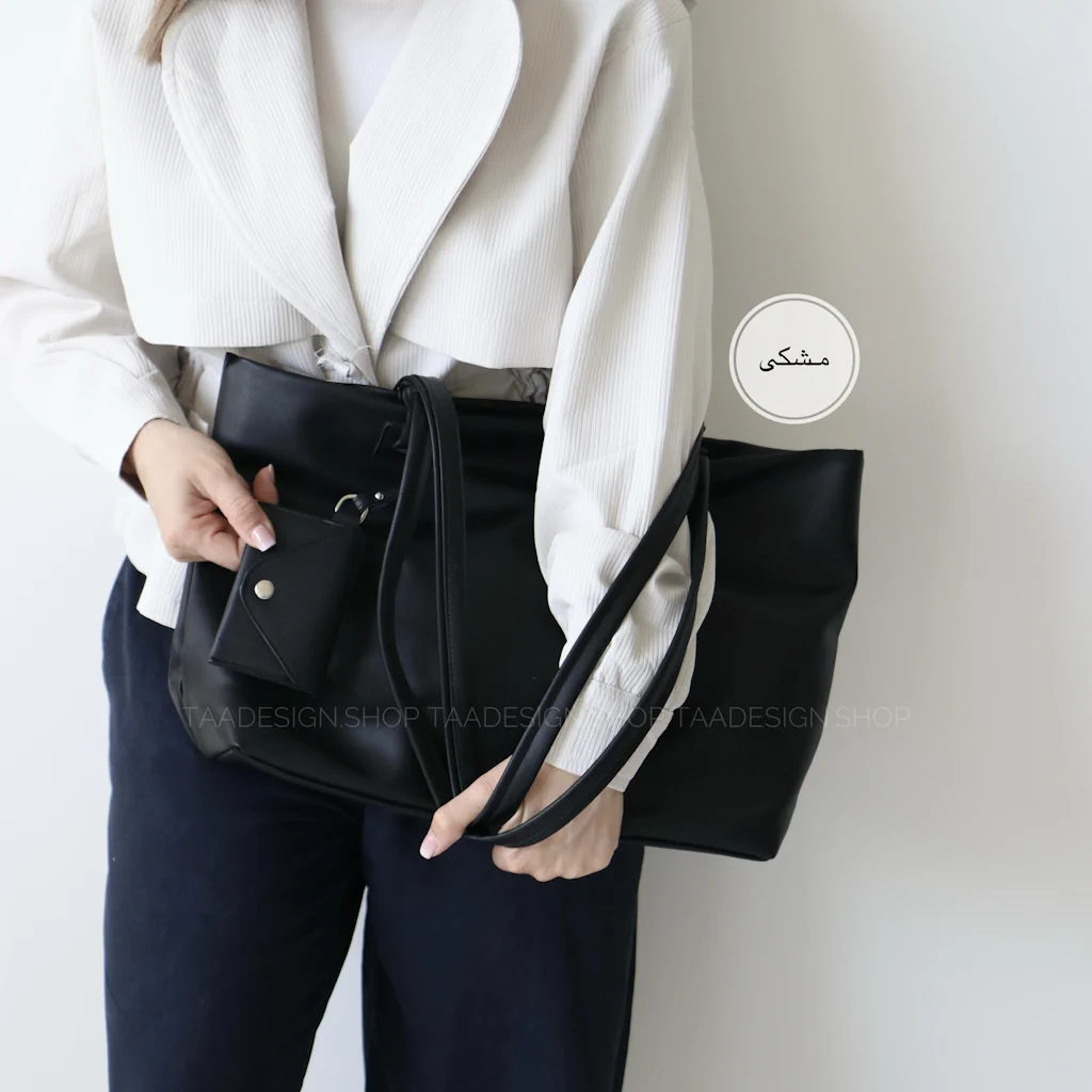 - فضای داخل و بیرون کیف: دارای یک فضایسه خونه به همراه قفل آهنربایی و داخل کیف دارای دو جیب، یک جیب بهمراه زیپ میباشد و دارای آویز جاکارتی